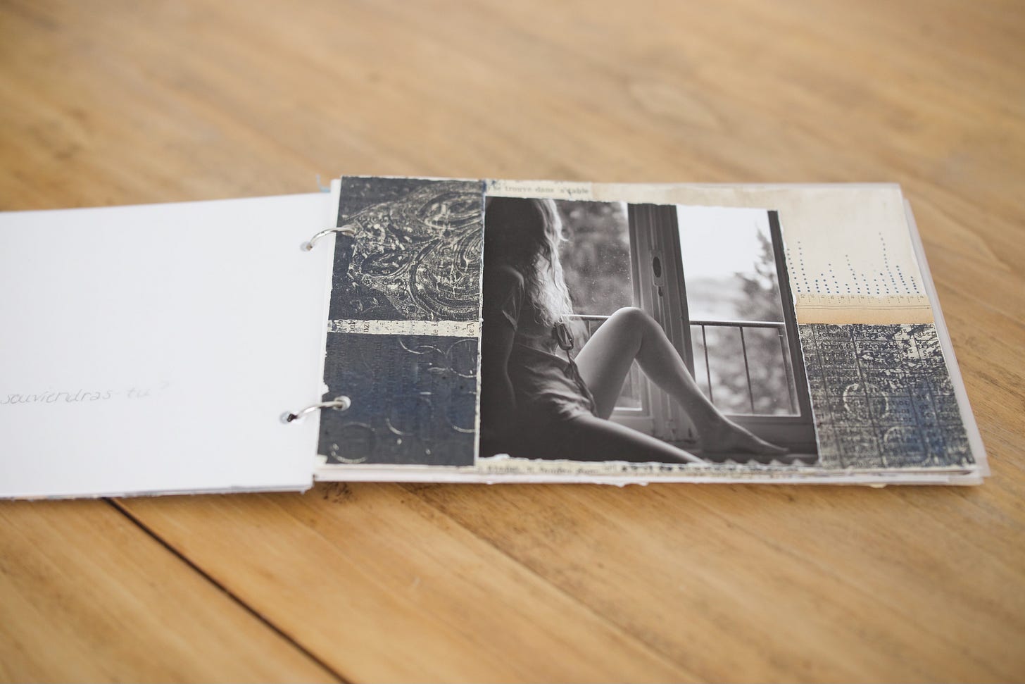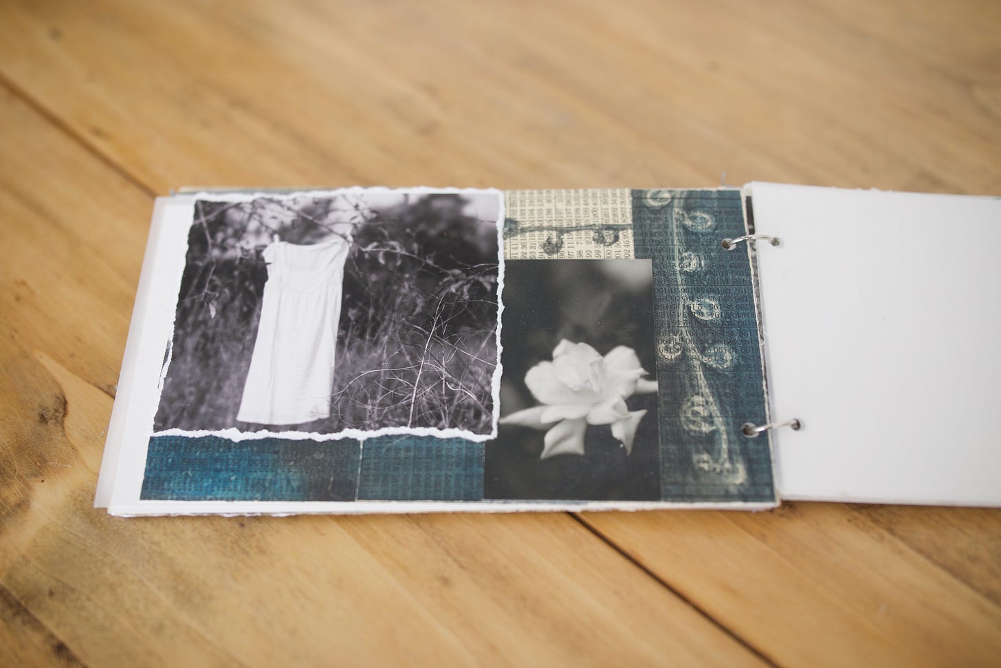 Once the pages started to fill up, I had the idea to cut them free from their spiral binder and to reassemble them with two small binder rings. In the past, when I made artist’s books, I bound them with thread in a more traditional way. The binder rings were simple to use, and I find a certain utilitarian charm in them. This allowed me to insert blank pages in between each collage, and to add vellum pages as well. I have a deep love of vellum in books. The silly texture and translucence speak to memory, which is often somewhat hazy and dream-like as we call things to mind. I decided to sift through my box of small, previously unused prints and add some photos. The story became richer and felt more true to me, as photography is still the heartbeat of my artistic process.